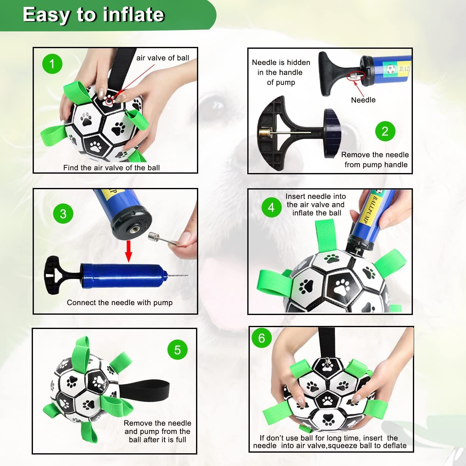 Interactive dog toys: Dog soccer ball can not only help your dog fight anxiety,depression and boredom,reduce mischievous behaviour and provides long-lasting entertainment,but also enhance good relationship between you and your pet by interactive outside game. Dog balls are not only a jolly dog toy, but also cute cat toys.Durable Puppy Toys Soccer Ball with grab tabs: Dog football is made of high quality PU,pure cotton yarn rubber lining and nylon materials, anti-bite, very strong and durable for not a chewer. The nylon tabs design make it easier for the dogs to fetch, toss, tug and retrieve. It is best dog toys to keep them busy,suitable for indoor and outdoor use.There's a longer handle for people to hold onto the ball to train your dogs.Floating Ball Toy for Dogs: Puppy toys interactive football is waterproof,no water absorption,no seepage, no deformation,lightweight,easy to float in water, so whether it is on the lawn, beach, swimming pool, lake, inside or outside, you can enjoy happy time with your pet dogs. It is a great dog water toy.Pump and Needle Adapter Included: There's a needle point adapter and a pump inside.The balls for dogs comes deflated. so you'll have to pump it up with the supplied pump and pin. Simply remove the needle from the pump handle, screw it into the pump, and pump up the ball until dog ball is full. The dog fetch ball provides hours of fun both indoors or out.Pls kindly note: The dog toy ball is only dog toys interactive ,it is not meant for a dog to bite unless only directly on the tabs, so the soccer ball for dogs is not suitable for aggressive chewers. Dog soccer ball with grab tabs is 6 inches in diameter, perfect for small & medium pets about 20-60 lbl. The package include 1xball, 1xpump, 2xneedles, 1x instruction manual .